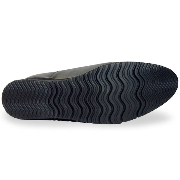 スニーカー感覚でお履きいただけるビジネスシューズ(カジュアルドレス紳士靴)。アッパー(甲革)は良質なレザー(牛革)で足馴染みが良く、裏地(ライニングおよびインソール)も天然皮革(山羊革)で吸湿性に富みやわらかな足入れです。幅(ウィズ)も3E(EEE)と余裕があり履き良く、ソールは軽量かつクッション性・屈曲性に優れた厚めの合成ラバーソール(中間層は軽量EVA)で、普段のビジネスシーンだけでなく、オフィスカジュアルでのビジカジスタイル(軽装)にもぴったりな一足。ソールには厚みがあります(ソール部2.0cm×ヒール高3.5cm)ので、歩行時の足への負担を軽減し、脚長効果もあります。
