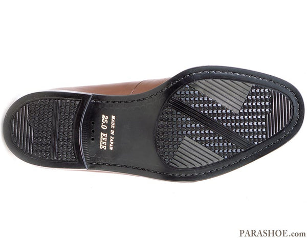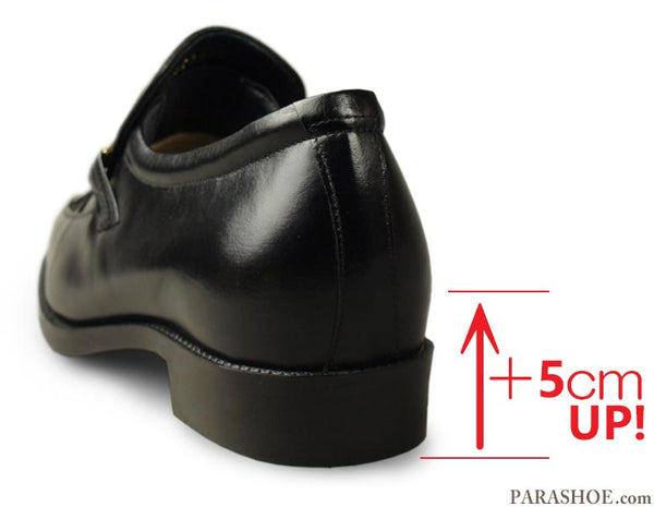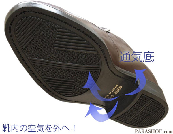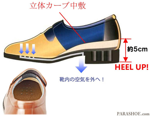 シークレットブーツ(シークレットシューズ)や、ハイアップシューズをお探しの方にオススメ。履くだけで、+5.0cm背が高くなる靴。外見は普通の紳士靴なので、誰にも気付かれずに、身長を高くし脚長効果を得ることができます。アッパーは高級カンガルー革と牛革のコンビで柔らかく、ライニング(裏地)はナイロンメッシュで吸湿性が良いです。ソールは、軽量かつクッション性と耐摩耗性に優れたウレタン系ラバーソールです。空気循環ソールになっていて、靴内の空気を外へ逃がすことで足蒸れを軽減します。(エアホールから雨は入りません。)インソール厚アップ分を考慮して、かかとが深めに造られており履きよい設計となっています。シルエットはスタイリッシュかつ、足幅は幅広甲高4E(EEEE)ワイズで足入れも良く、国内自社工場での生産にこだわりつづける国産(日本製)のしっかりした造りの紳士革靴です。