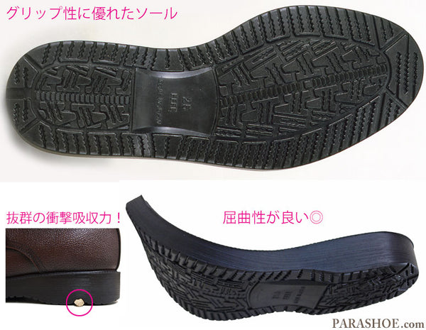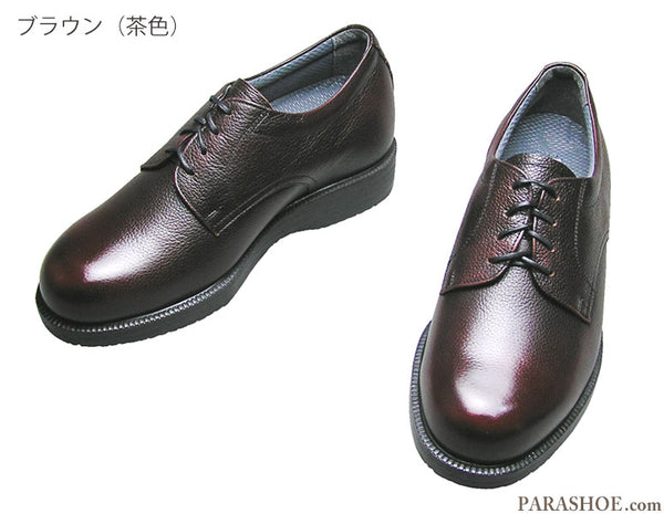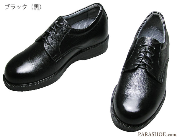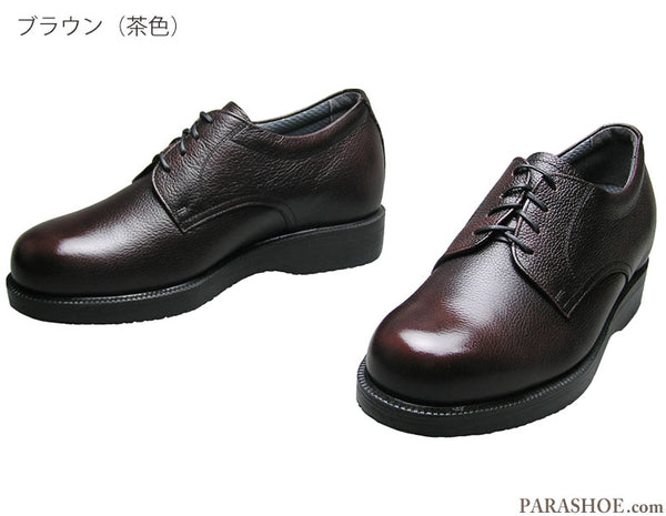 シークレットブーツ(シークレットシューズ)や、ハイアップシューズをお探しの方にオススメ。履くだけで、+5.5cm背が高くなる靴。外見は普通の紳士靴なので、誰にも気付かれずに、身長を高くし脚長効果を得ることができます。アッパーはシボ感のあるソフト牛革で柔らかく、ライニング(裏地)は吸汗性と足あたりの良いナイロン素材です。ソールは、軽量かつクッション性と耐摩耗性に優れたウレタン系ラバーソールで、グリップ性とクッション性(柔軟性)、衝撃吸収性を兼ね備えています。インソール厚アップ分を考慮して、かかとが深めに造られており履きよい設計となっています。足幅も幅広甲高4E(EEEE)ワイズと足入れも良く、国内自社工場での生産にこだわりつづける国産(日本製)のしっかりした造りの紳士革靴です。